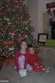 We went over to my parents house for Christmas Eve. My parents have a tradition where they have the kids take out some oats & glitter & sprinkle all over the grass. The oats that the reindeer can smell & the glitter to see what house they are to go too. They get so excited they like to see out the window to see if they can spot Santa. Santa drops them off some Christmas pajamas w/ their names on the presents & a balloon attached to the presents. So every year they get some pajamas to wear on Christmas Eve. Thanks, Dad & Mom for that fun tradition, the kids love...